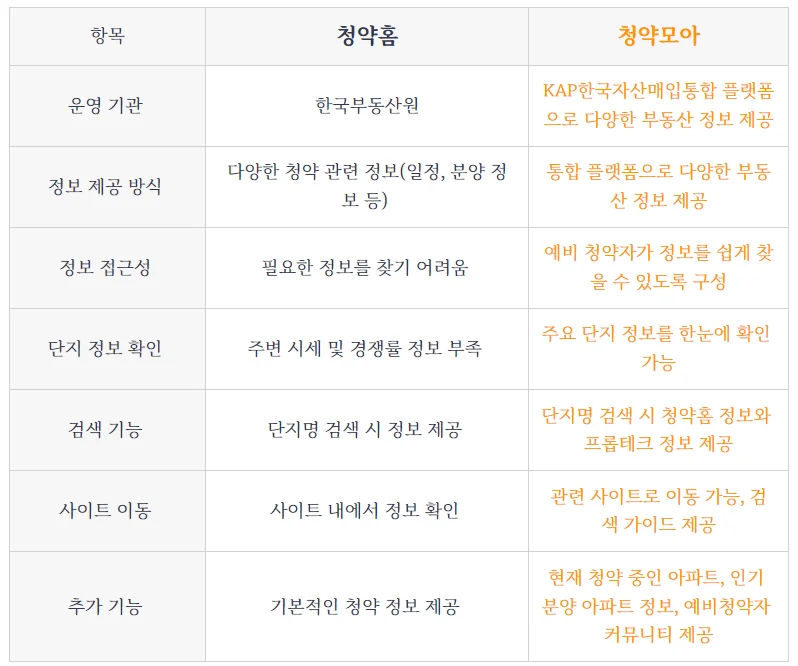 청약홈과 어떤 부분이 다른지 궁금하신 분들은 아래 표를 참고해 주세요.