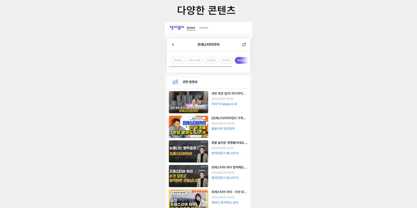 원하는 단지명을 검색하면 청약홈 정보뿐 아니라 관련 유튜브 영상, 뉴스 기사 등 다양한 콘텐츠와 이슈를 함께 확인할 수 있습니다.