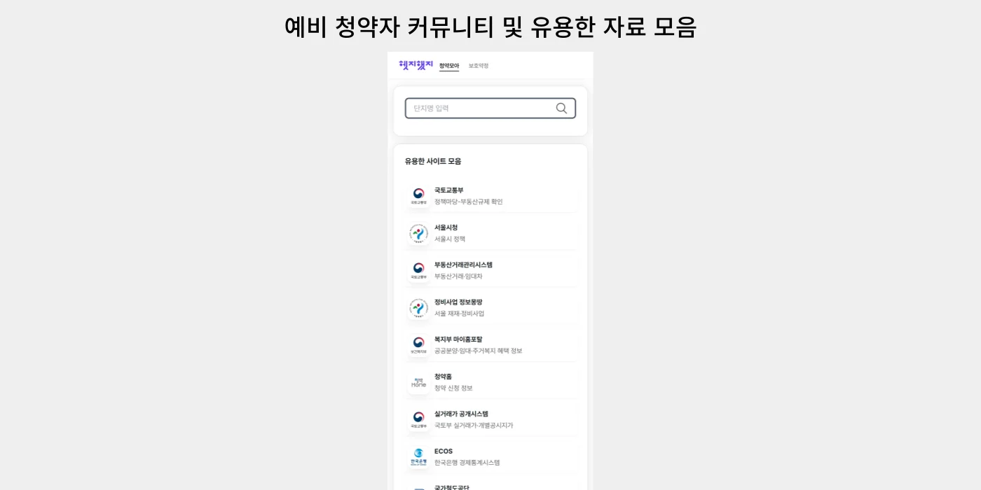 예비 청약자들이 소통할 수 있는 커뮤니티와 함께, 현재 청약 중인 단지, 인기 분양 단지 정보, 청약에 필요한 유용한 사이트도 모아두었습니다.
