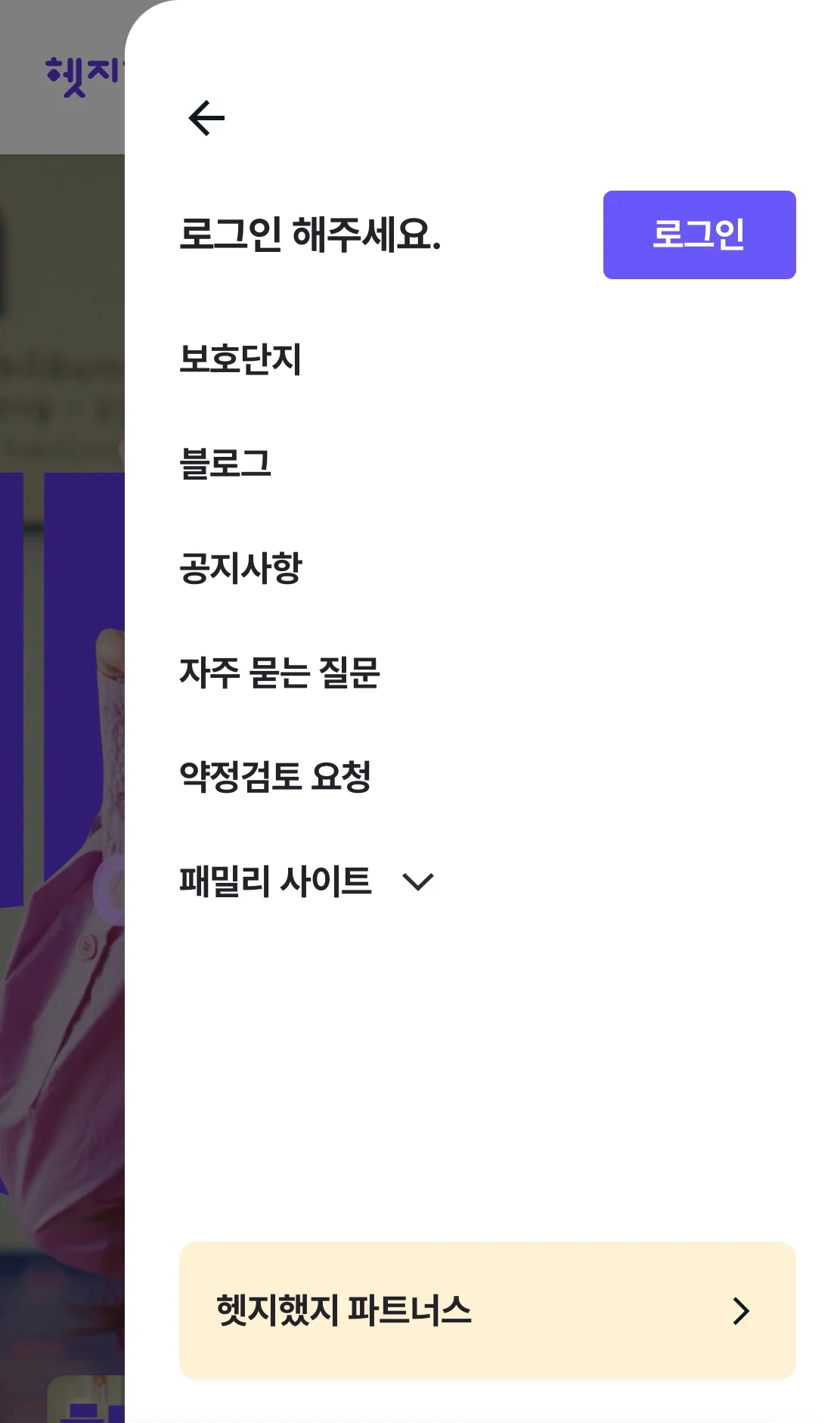 헷지했지 홈페이지에 접속해서 페이지 상단 우측에 ‘메뉴바’를 클릭합니다.