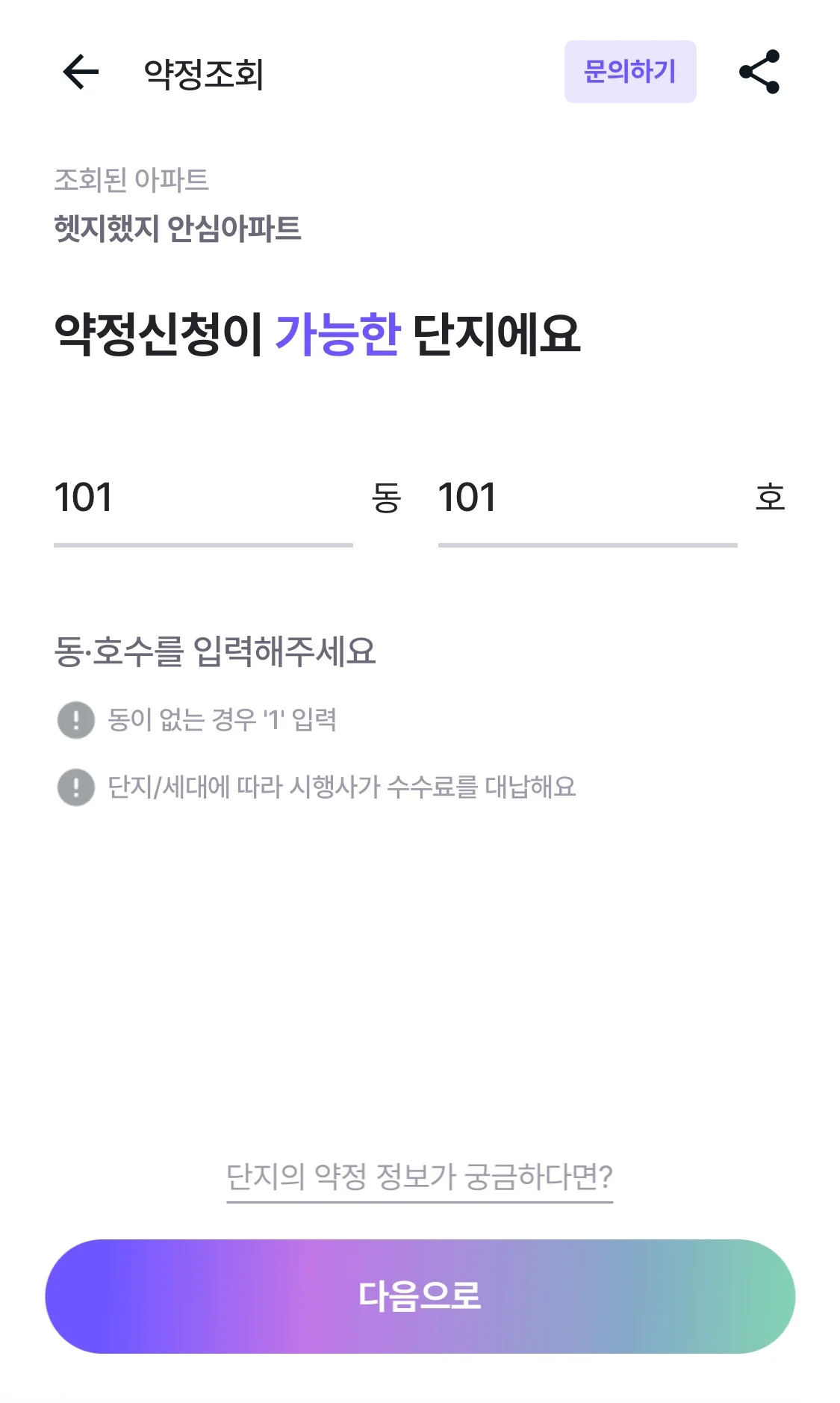 약정 신청을 하고 싶은 아파트의 동,호수를 입력합니다.