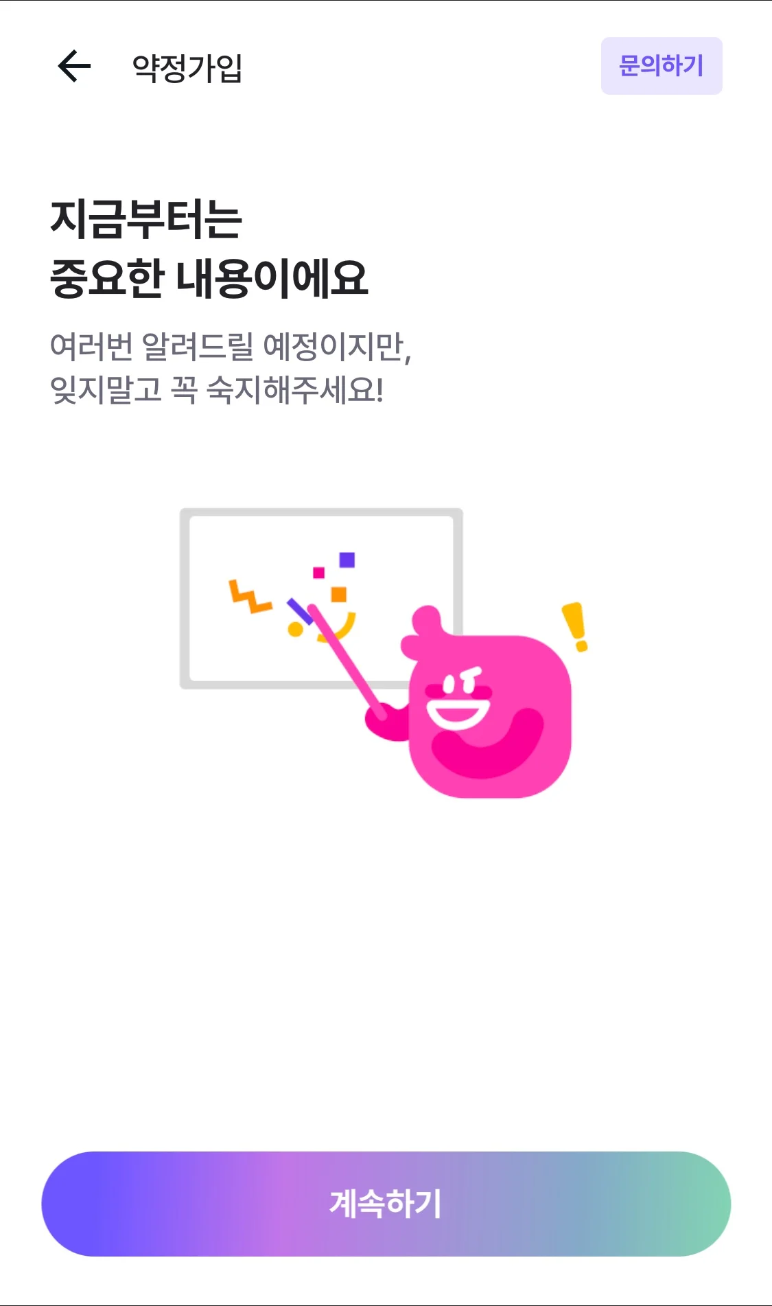 본인 인증이 완료된 후, 약정 안내 페이지로 넘어갑니다.