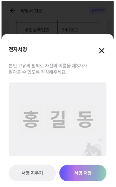 약정서(계약서)를 읽은 후에 ‘동의합니다’ 버튼을 누른 후 ‘전자서명’을 하면
