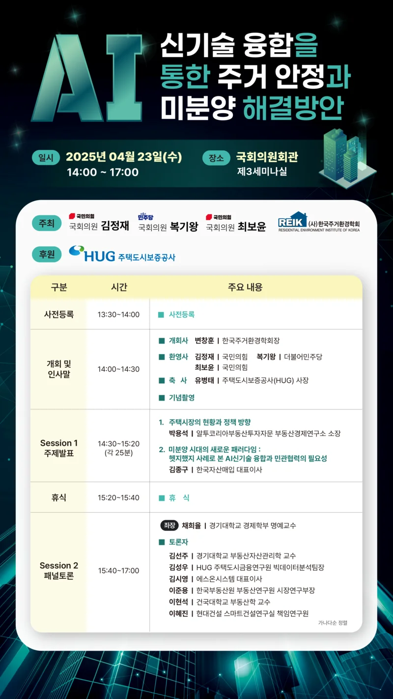 (사)한국주거환경학회는 국민의힘 김정재·최보윤 의원, 더불어민주당 복기왕 의원과 공동으로 오는 4월 23일(화) 오후 2시, 국회의원회관 제3세미나실에서 ‘AI 신기술 융합을 통한 주거 안정과 미분양 해결 방안’ 세미나를 개최한다고 밝혔다. 이번 행사는 HUG(주택도시보증공사)가 후원한다.