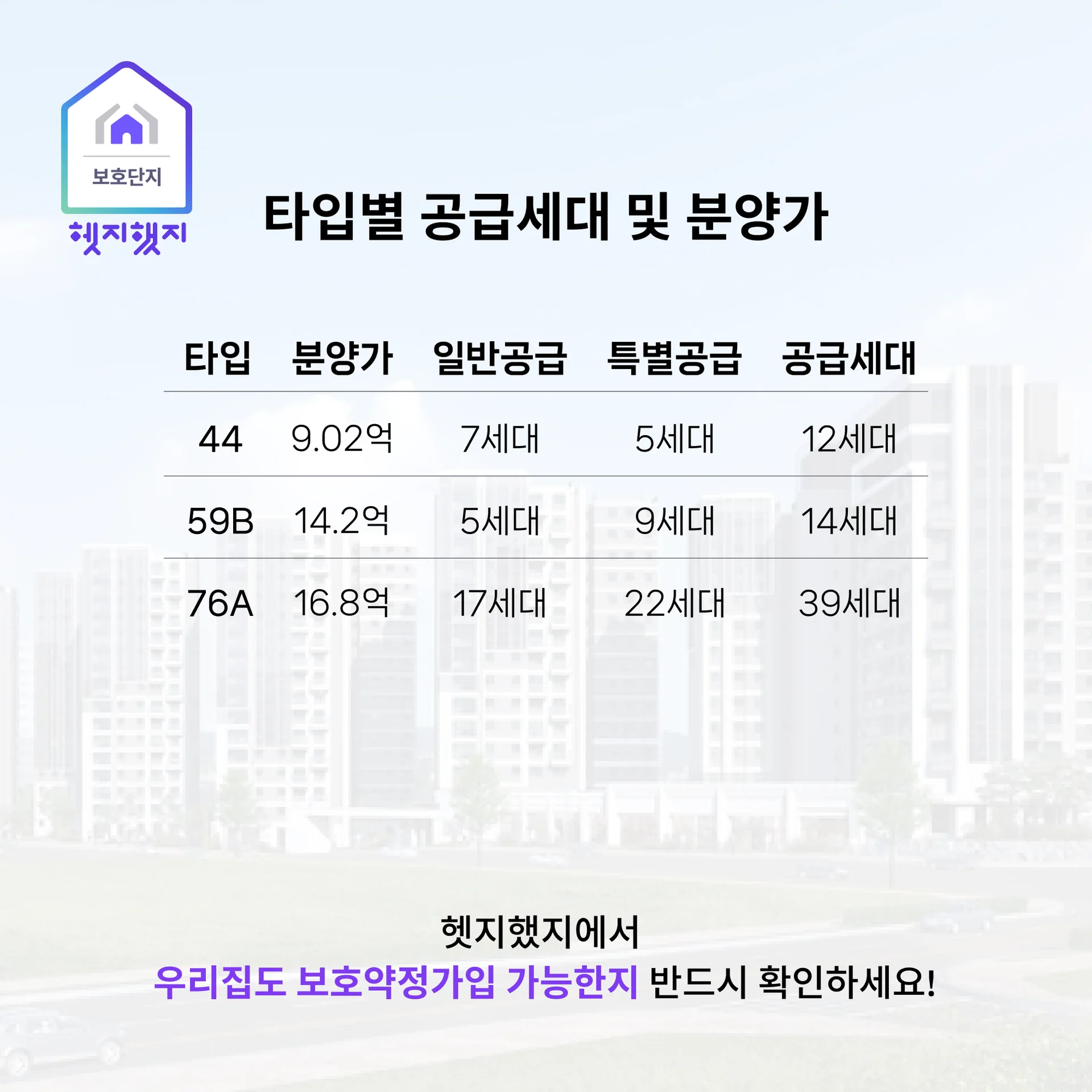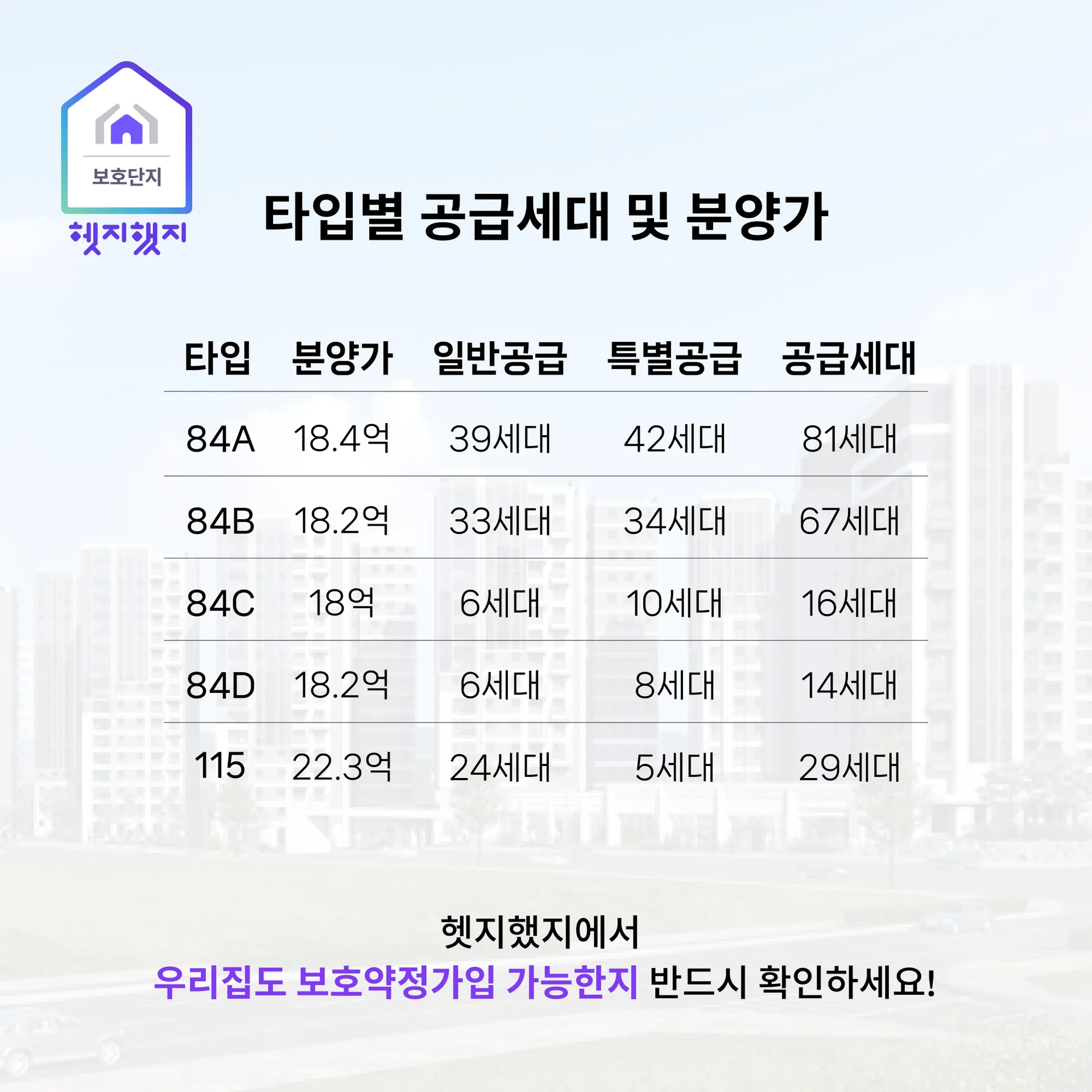 9개 타입(44·59·76·84·115)으로 1~2인부터 4인 가구·희소 대형까지 폭넓게 흡수합니다.
